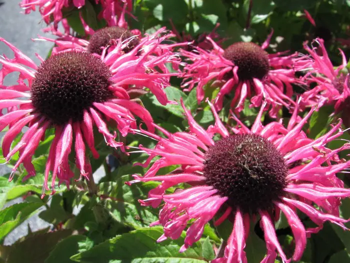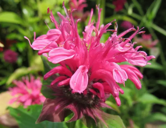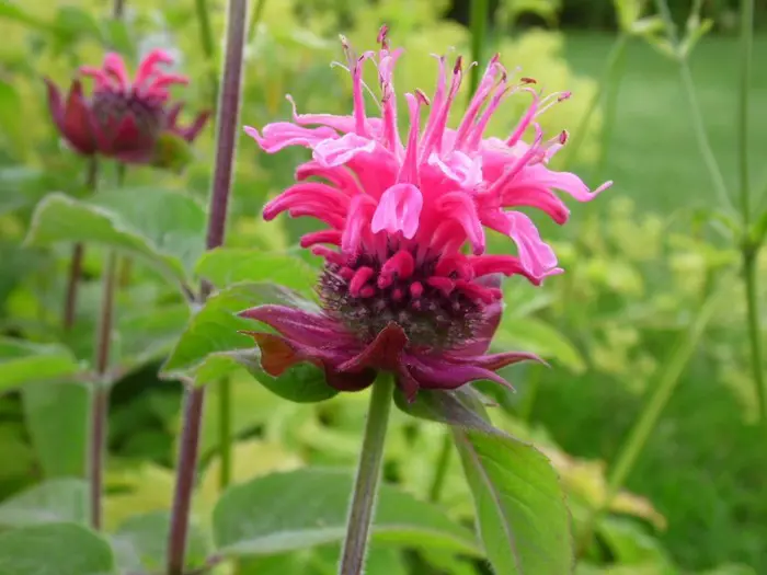 Monarda didyma 'Pink Lace' ist eine kompakte, buschige Sorte mit wunderschönen, glänzenden grünen Blättern, manchmal mit einem violetten Farbton. Die Blätter sind aromatisch und riechen nach Bergamotte