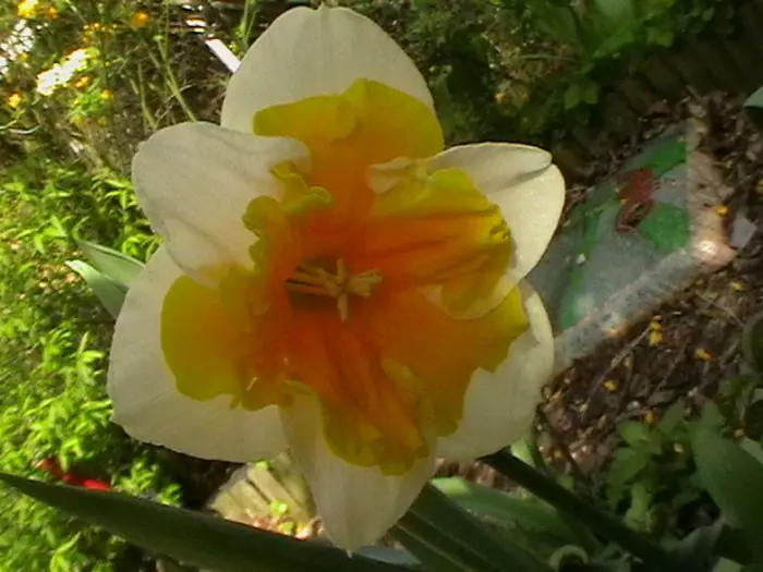 Weiße Kelchblätter mit einer sehr auffälligen, warmen gelben Fransenkrone. Die Krone öffnet sich flach.