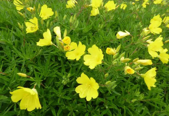 Oenothera 'Cold Crick' ist ein blühender Hybrid, der ein kompaktes Polster aus kleinen, untertassenförmigen, leuchtend goldgelben Blüten und langgestreckten, tiefgrünen Blättern bildet.