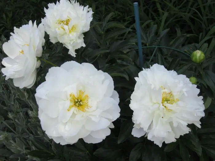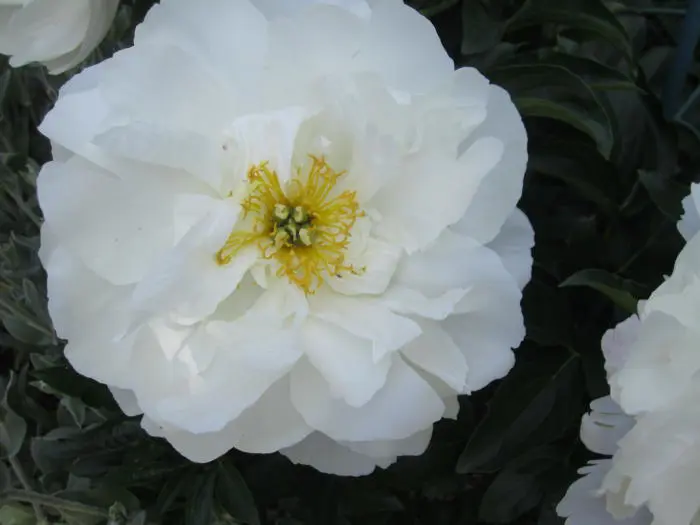 Die Blütenknospen der Paeonia lactiflora 'Miss America' sind zunächst Perlmutt, blühen aber weiß mit sichtbaren gelben Staubblättern.