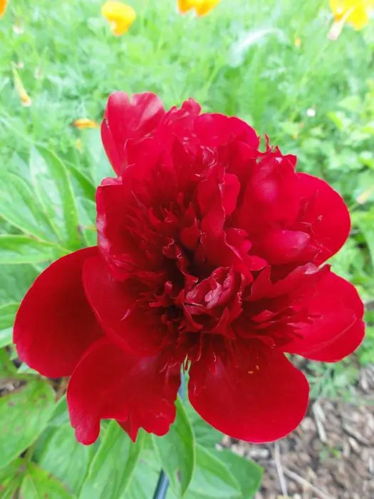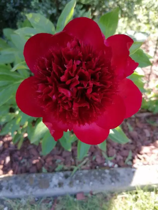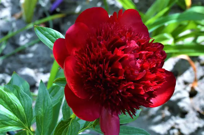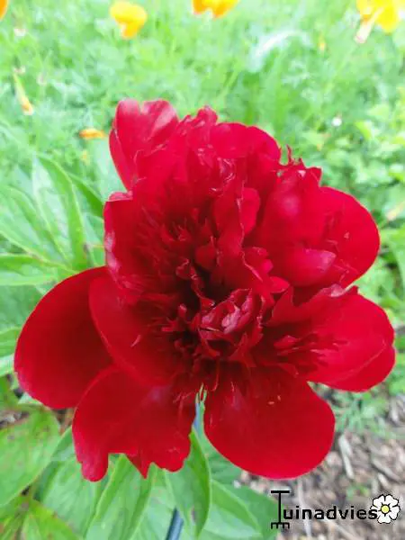 Eine krautige Pfingstrose mit gut gefüllten, tiefroten Blüten.