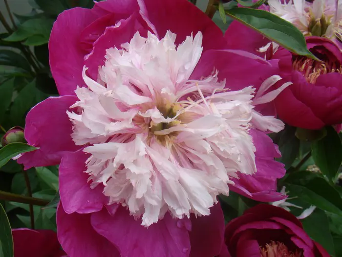Paeonia lactiflora 'White Cap' ist eine zweifarbige Pfingstrose. In der Mitte das blassgelbe bis weiße verfärbte Herz mit rundherum bestickten Blütenblättern.