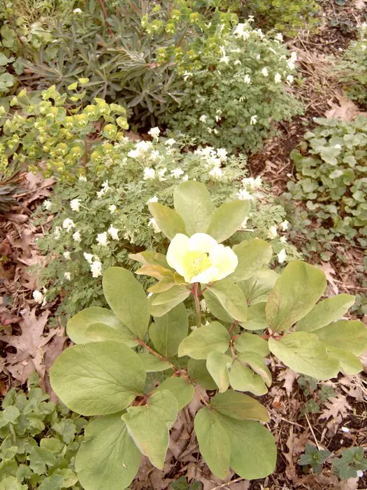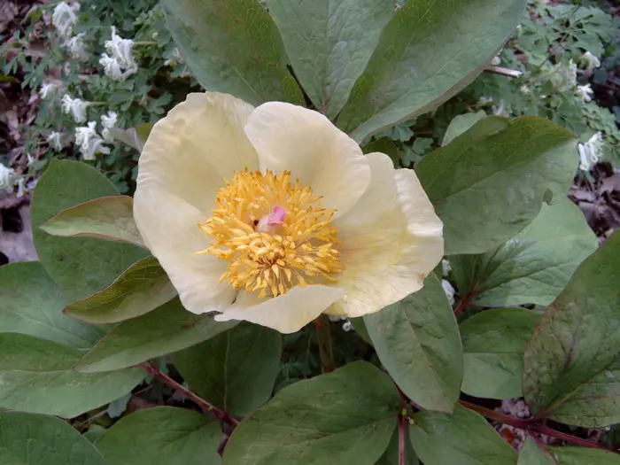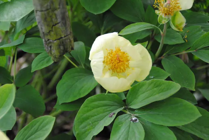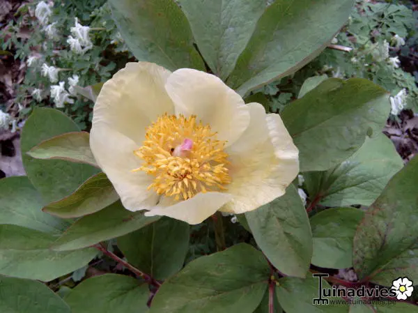 Paeonia mlokosewitschii ist eine botanische Art mit sanften gelben Einzelblüten und einem auffälligen Herzen aus langen orange-gelben Staubblättern.