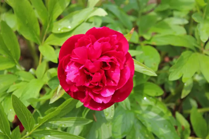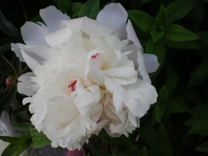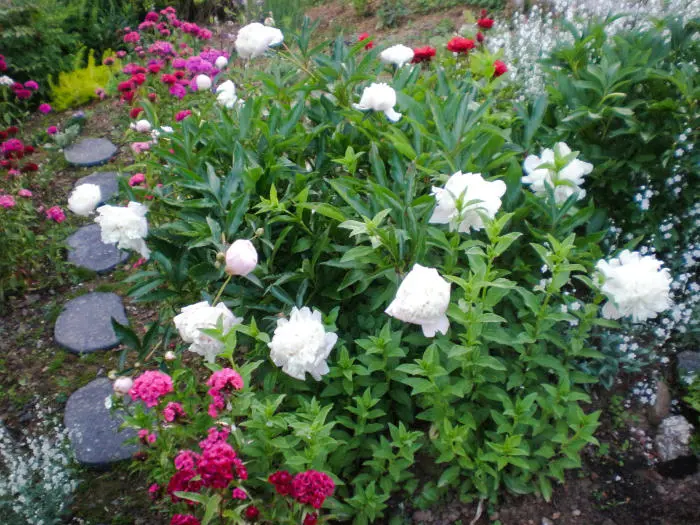 Paeonia officinalis 'Alba Plena' ist eine bekannte Gartenform mit gut gefüllten, kelchförmigen weißen Blüten.