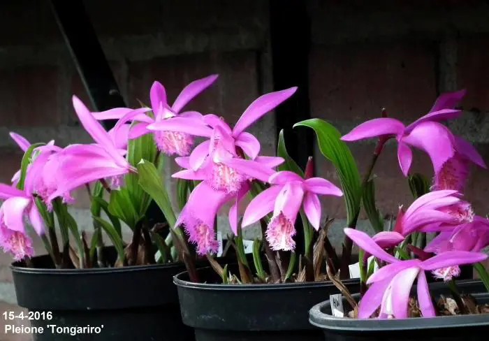 Pleione 'Tongariro' stammt aus Asien. Blühen Sie mit relativ großen Blüten im Verhältnis zur Pflanze.