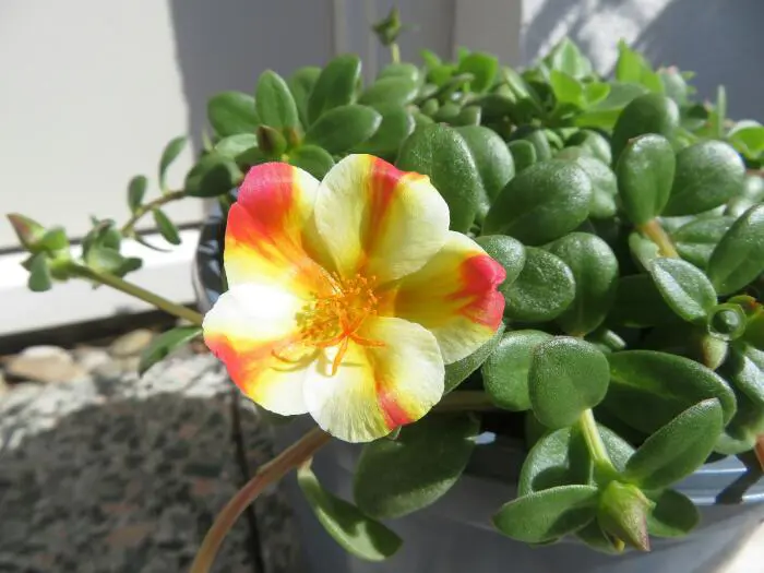Die kleinen, fleischigen Blätter verbinden sich schön mit den farbenfrohen gelben, orangen, roten und rosa Blüten.