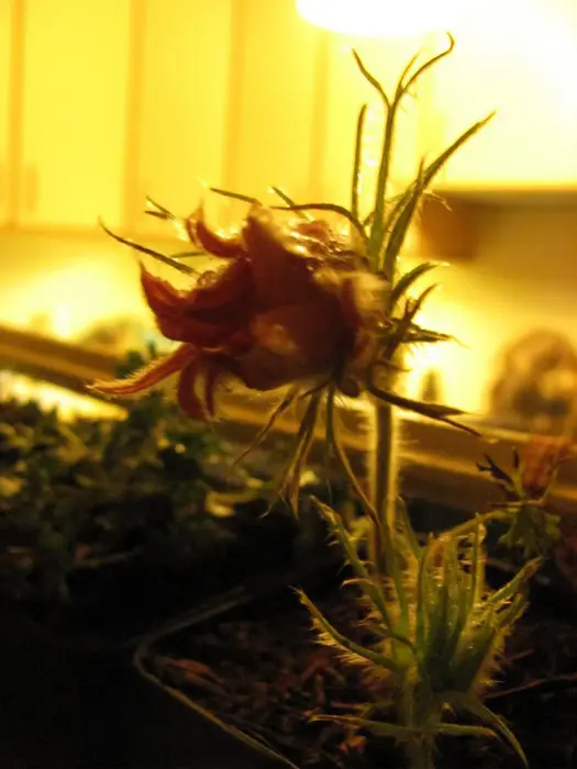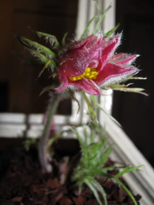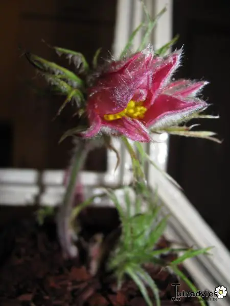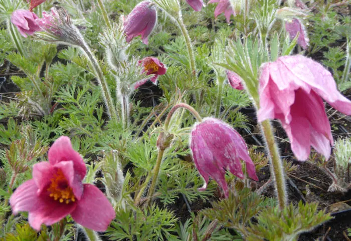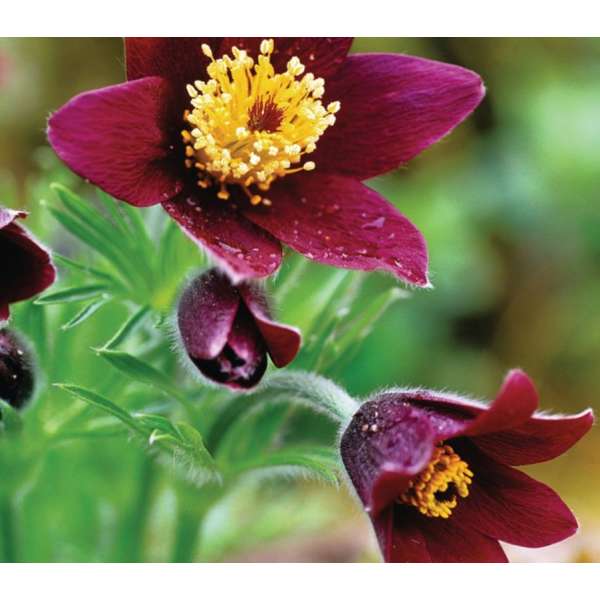 Die glockenförmigen, rötlich-violetten Blüten blühen auf aufrecht bis nickenden, behaarten Stängeln. Nach der Blüte folgen die seidigen, fluffigen Samenköpfe.