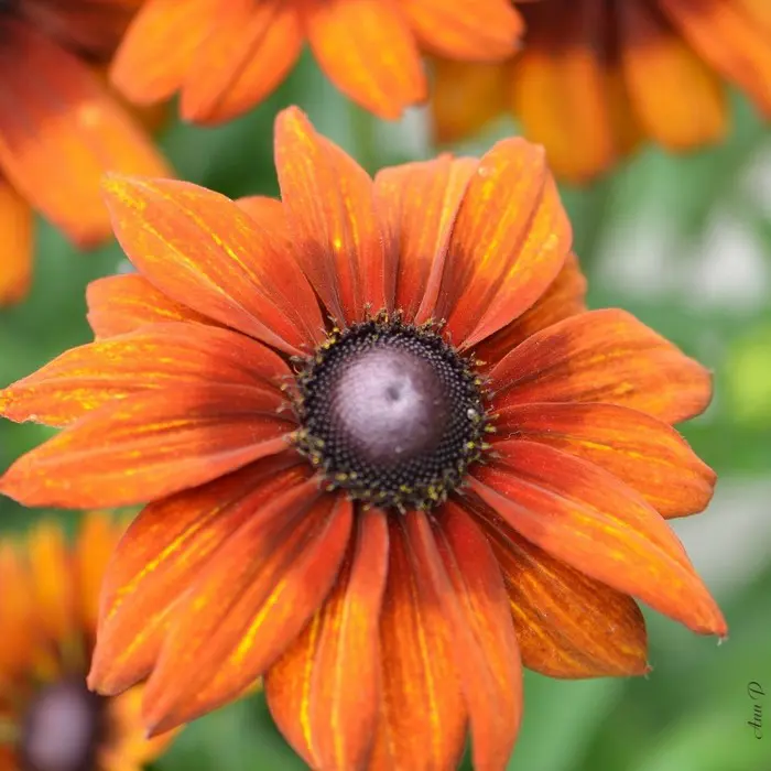 Rudbeckia Summerina Electra Shock: feine bronzefarbene, orangefarbene bis gelbe Blütenblätter um einen dunkelbraunen Zapfen. H.60 cm.