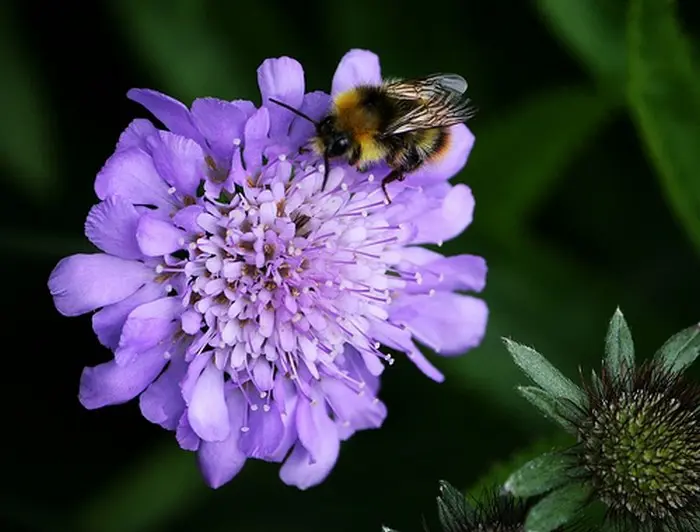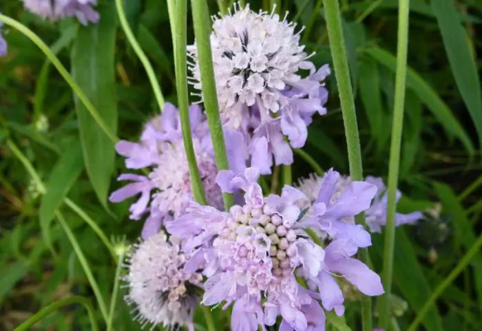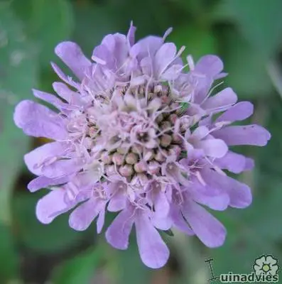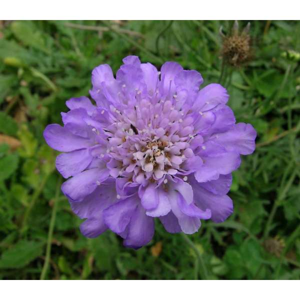 Scabiosa columbaria ist eine langblühende Pflanze mit einem breiteren Blütenkopf als die anderen Scabiosa-Arten. Die Blüten sind helllavendelblau, zur Mitte hin weißer.