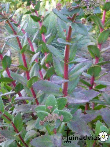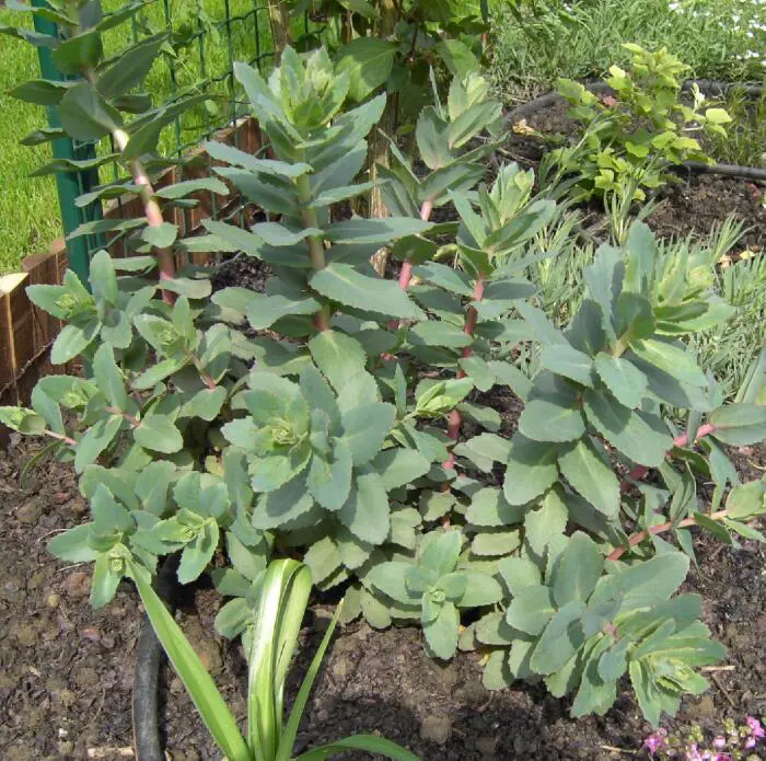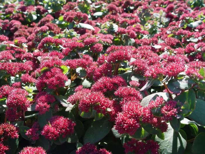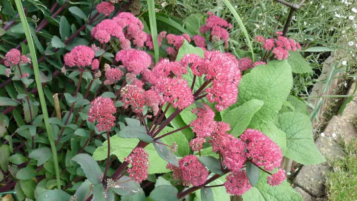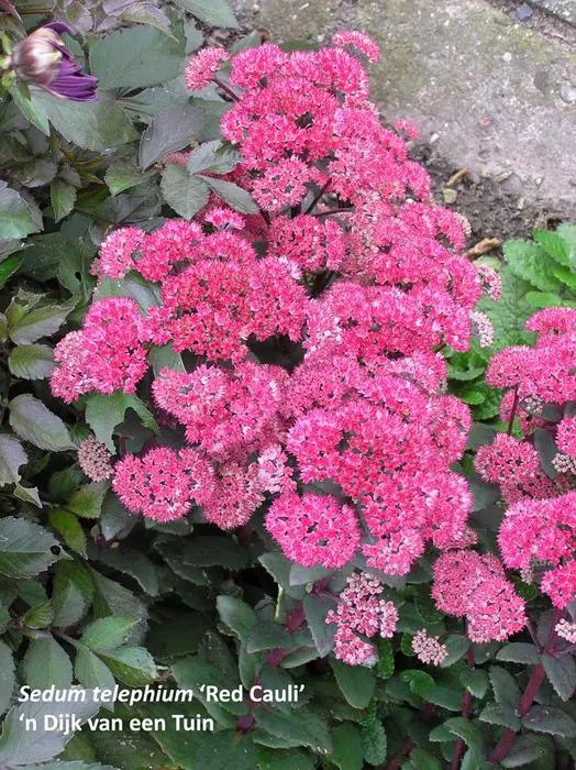 Sedum 'Red Cauli' blüht tiefrot/purpurrosa mit blau-grauen Blättern.
