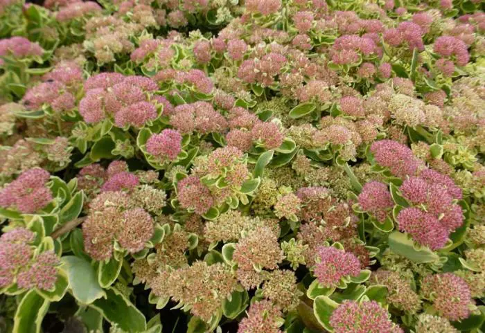Sedum (Herbstfreude-Gruppe) 'Lajos' hat fleischige, cremekantige blau-grüne Blätter.
