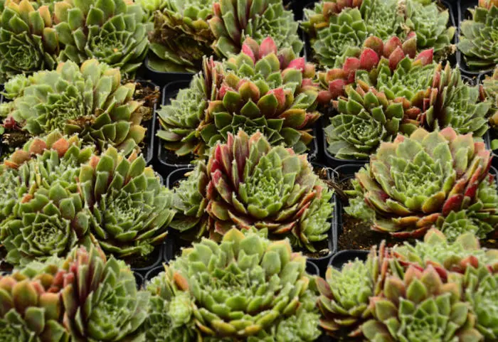 Sempervivum erythraeum 'Velvet Red' ist eine rasenbildende Pflanze, die kleine Rosetten bildet, die grün zu rötlich-braun werden.