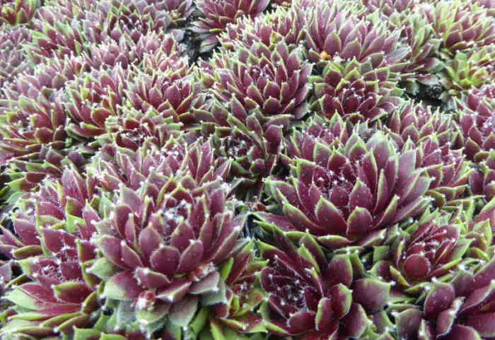 Sempervivum 'Silberkarneol' bildet ein bodendeckendes Kissen aus purpurroten Blattrosetten mit grauem Schleier.