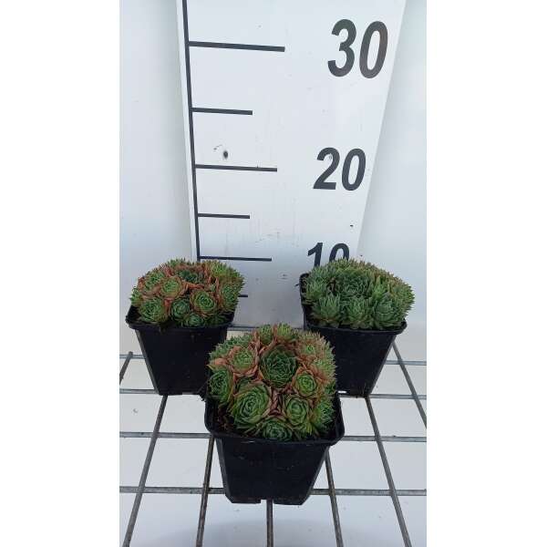 Sempervivum 'Triste' bildet Rosetten mit spatelförmigen Blättern. Zeigt meist sanfte graugrüne Töne oder wärmere Rottöne bis Orangetöne. Reagiert auf kalte Winter, indem er dunkelviolett wird.