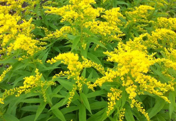 Solidago 'Strahlenkrone', aufrechte Staude, mit schmalen, lanzettlichen, dünn gezähnten, dunkelgrünen Blättern.