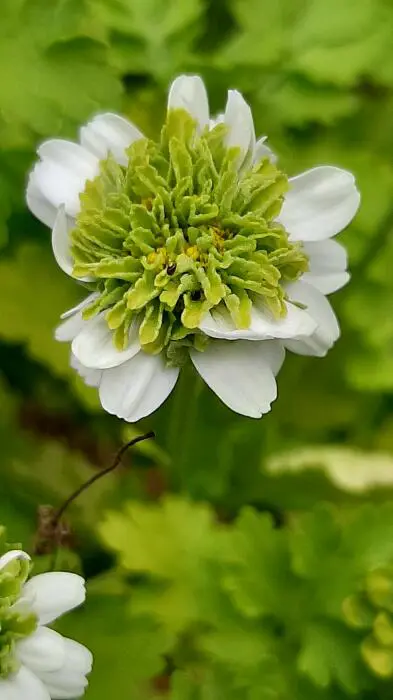 Die Randblütenblätter des Doldes sind weiß, tief eingeritzt und größer als die anderen.