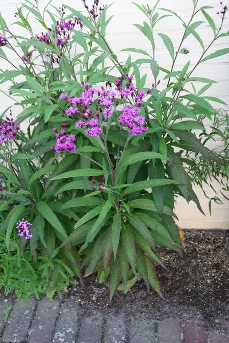 Vernonia crinita ist eine große, mehrjährige, holzige Art mit großen, robusten, geraden Stängeln und schmalen, langgestreckten grünen Blättern.