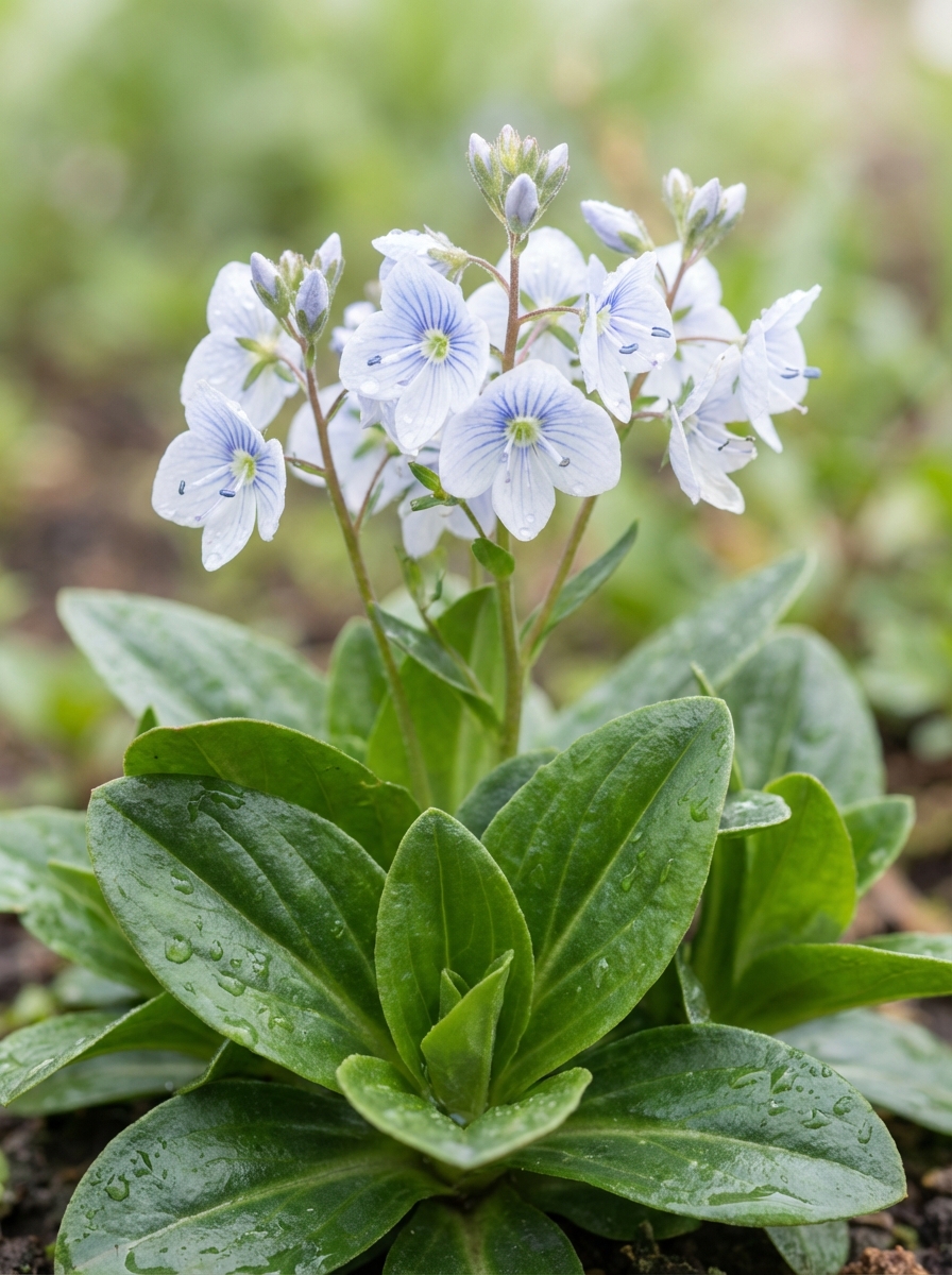 Veronica gentianoides ist eine Bodendeckerpflanze, die zunächst Rosetten aus dicken, runden, dunkelgrünen und glänzenden Blättern bildet, aus denen im Frühling schlanke Blütenstängel wachsen, bedeckt mit kleinen, hellblauen Blüten mit dunklen Streifen.