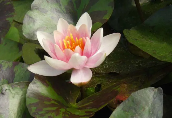 Die schwimmenden Blätter sind violett gesprenkelt, werden aber später grüner.