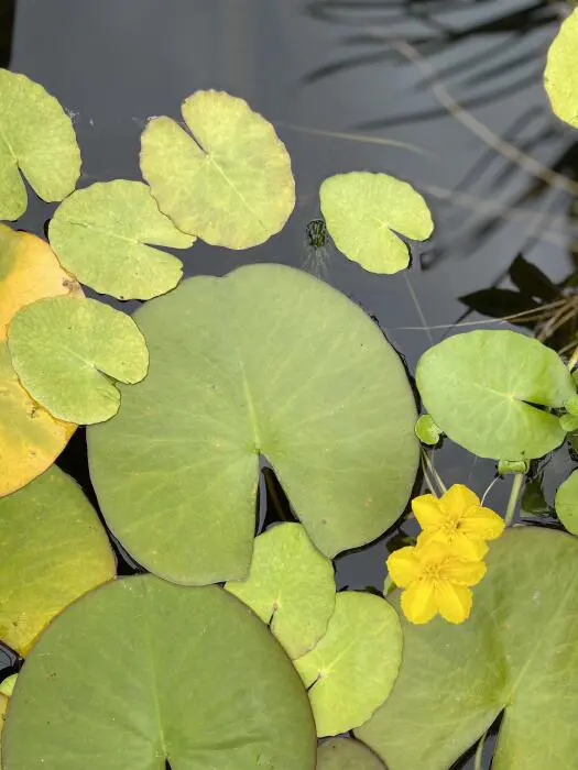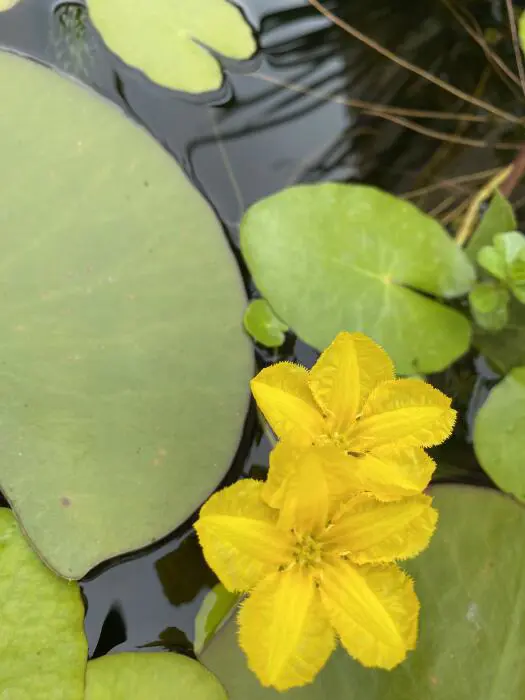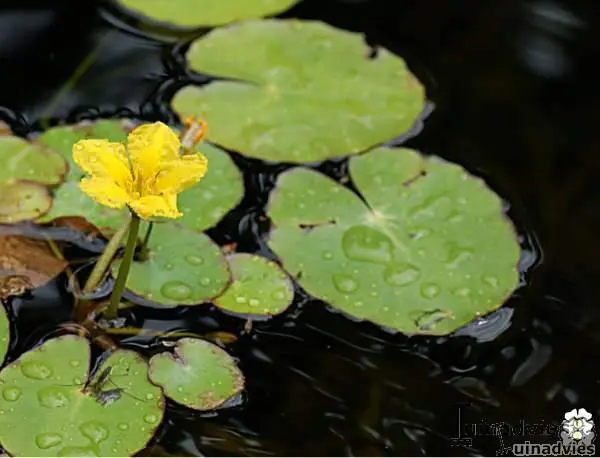Nymphoides peltata blüht mit leuchtend gelben Blüten, die zwischen herzförmigen Blättern schweben.