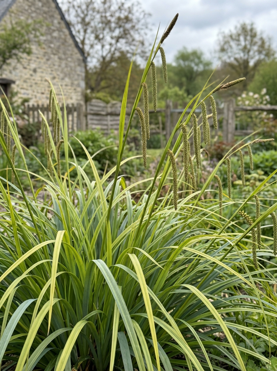 Ein hoher Carex mit auffälligen, schwahenden, federartigen Blüten.