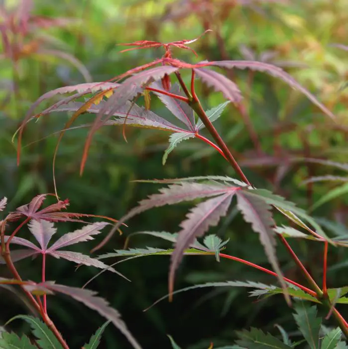 Acer palmatum 'Jerre Schwartz' ist ein kleiner japanischer Ahorn mit einer aufrechten, kompakten, schlanken Silhouette und zahlreichen und dünnen Ästen.
