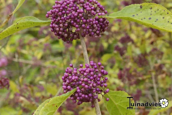 Blüht mit blassrosa Blüten, gefolgt von glänzenden, leuchtend fliedervioletten Beeren (ab September).