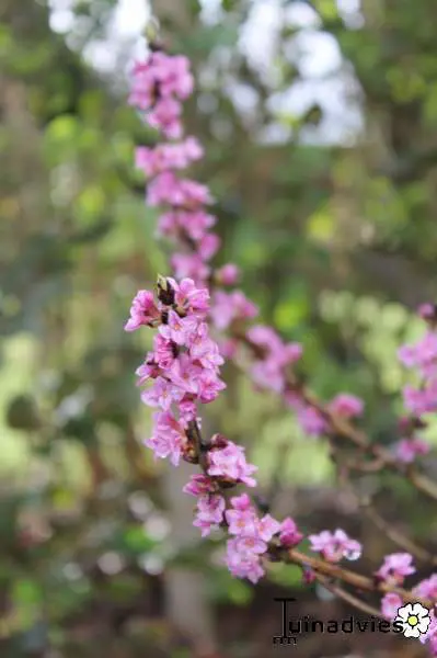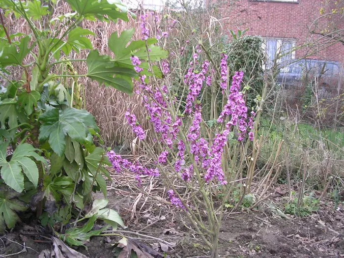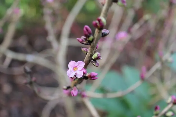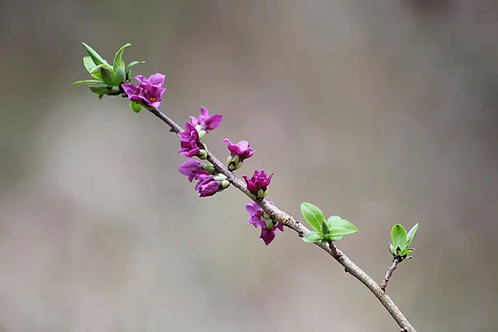 Daphne Mezereum blüht auf kahlen Ästen, bevor die Blätter mit rötlich-violetten Blüten erscheinen.