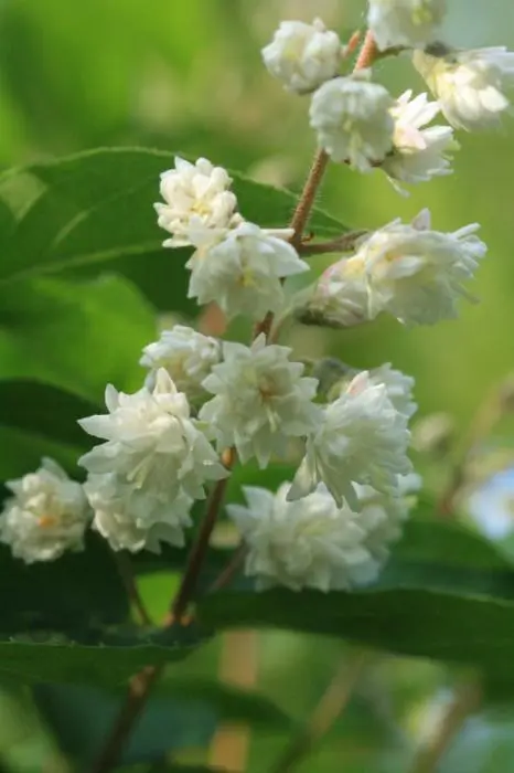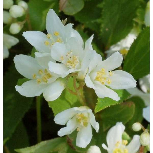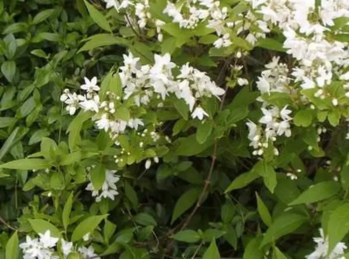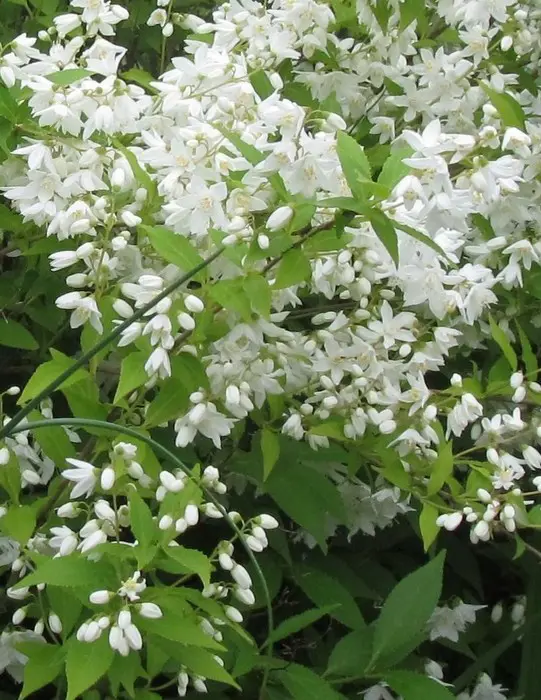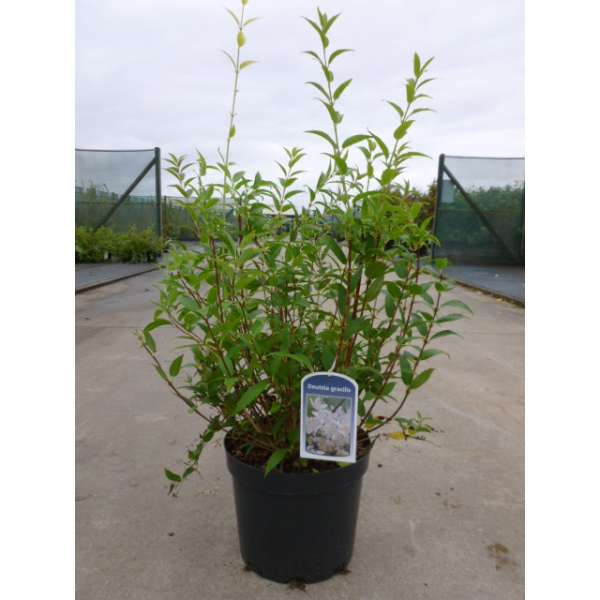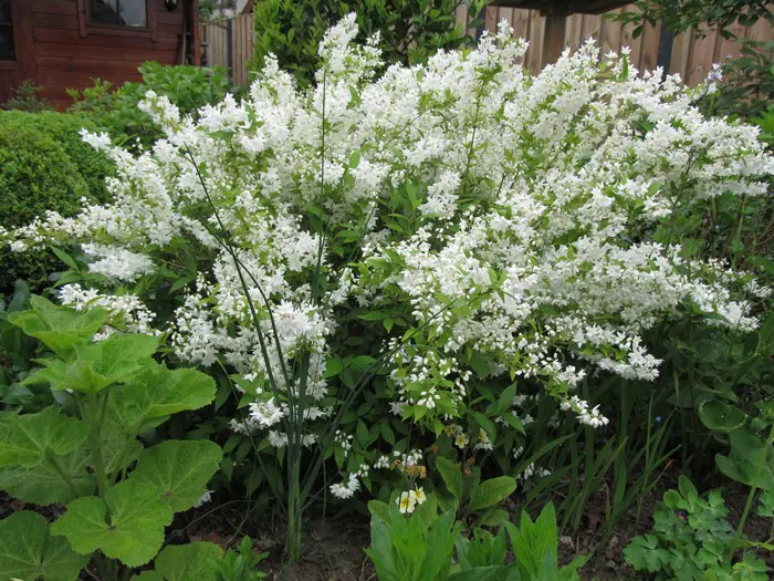 Deutzia gracilis ist ein japanischer, reich blühender kompakter Strauch, der mit kleinen weißen, sternförmigen Blüten bedeckt ist, die leicht duften.