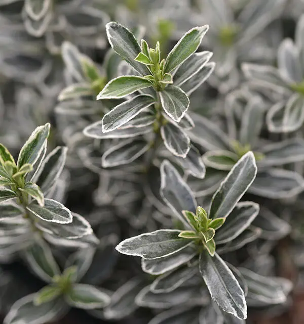 Euonymus japonicus 'Microphyllus Albovariegatus' ist ein kompakter, niedrig wachsender Strauch mit kleinen, silberweiß umrandeten dunkelgrünen Blättern.