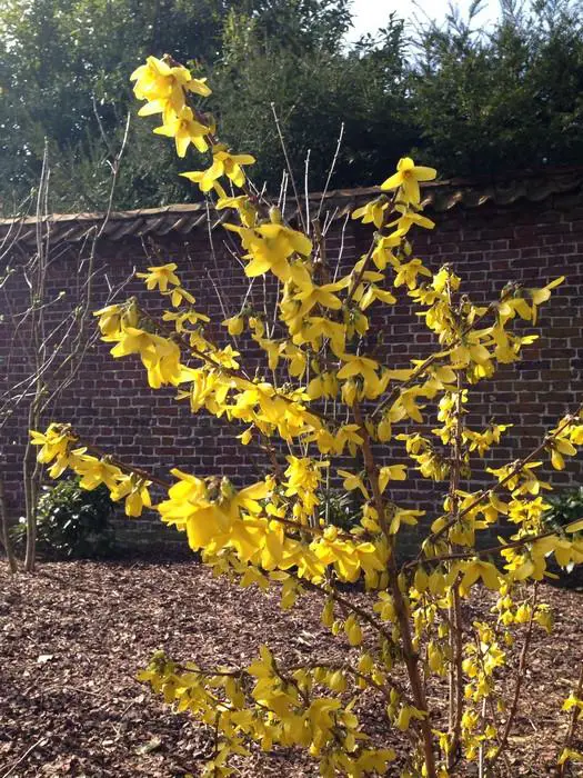 Forsythia x intermedia 'Goldrausch' hat eine kompaktere und aufrechtere Form als die Art und blüht auf den kahlen Ästen mit größeren goldgelben Blüten.