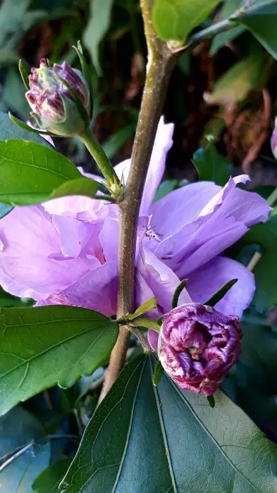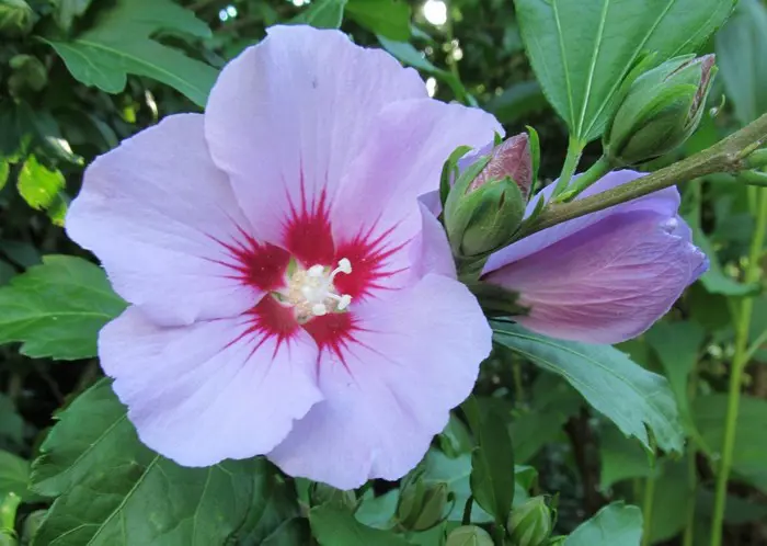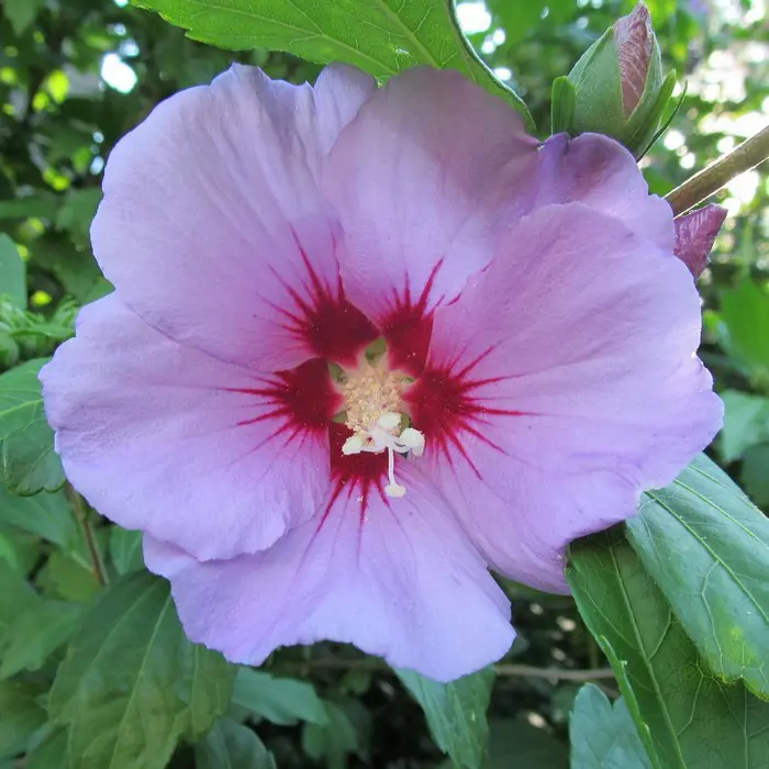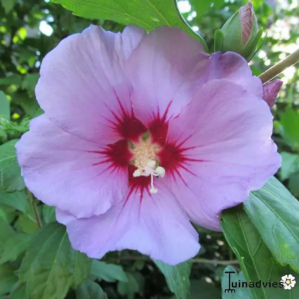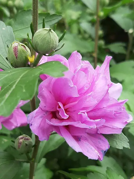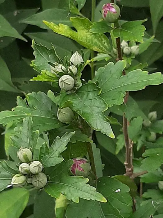 Hibiscus syriacus 'Ardens' ist ein aufrechter Strauch mit kompaktem Wuchs und dunkelgrünen Blättern, die im Herbst gelb werden.