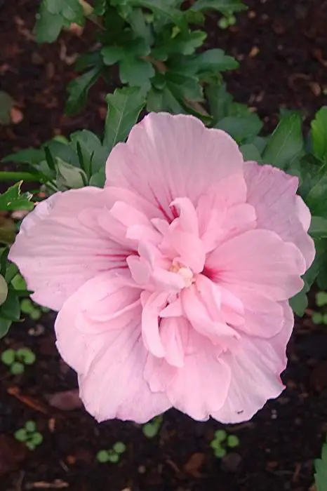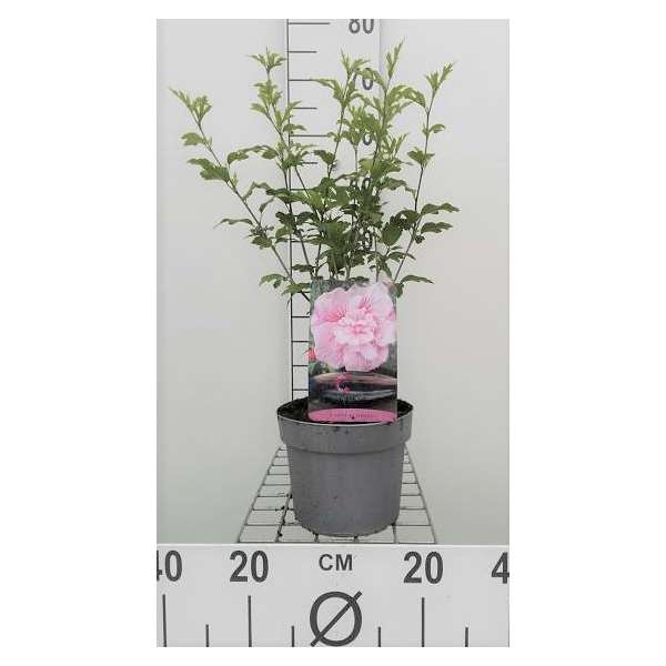 Hibiscus 'Pink Chiffon' ist ein aufrechter Strauch mit kompaktem Wuchs und dunkelgrünen Blättern, die im Herbst gelb werden.