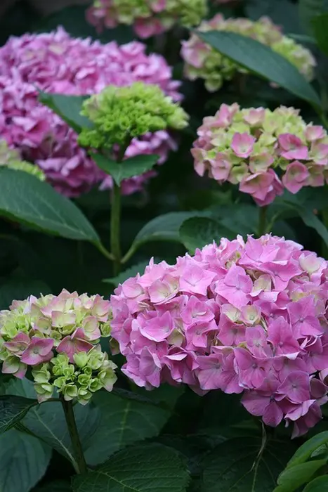 Rosa oder blaue Blüten in kugelförmiger Form.