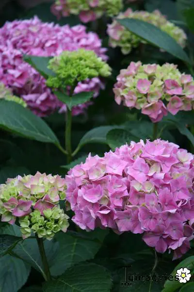 Durch die Behandlung mit Alaun färben sie sich blau, im Herbst werden die Blüten auch dunkler rosa oder grüner.