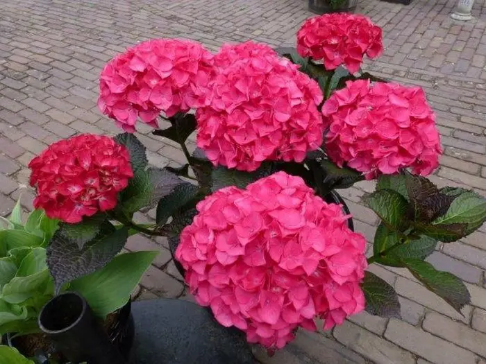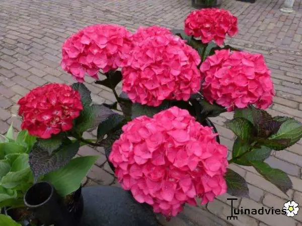 Hydrangea macrophylla 'Red Angel' hat rot-grüne Blätter mit markanten Adern und kugelförmigen, tiefpinken Blüten.