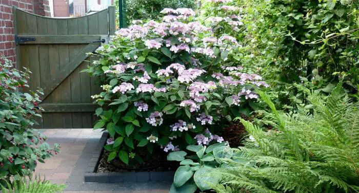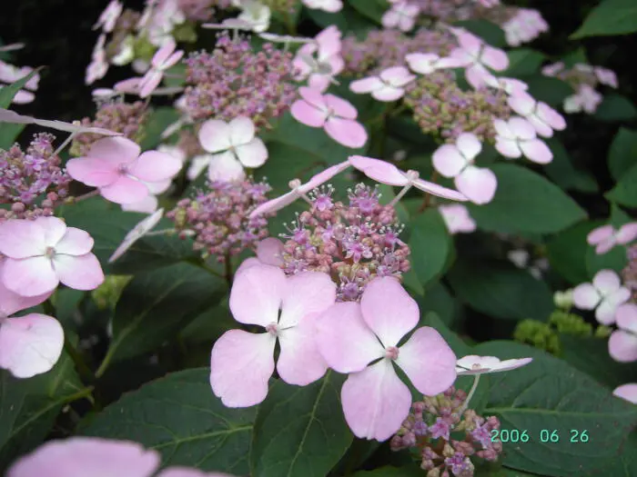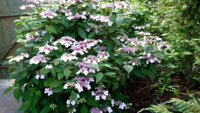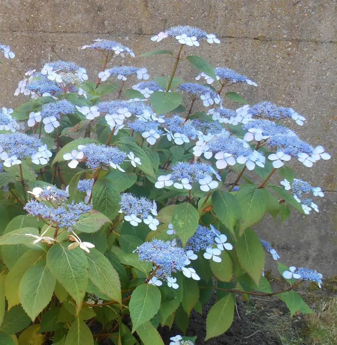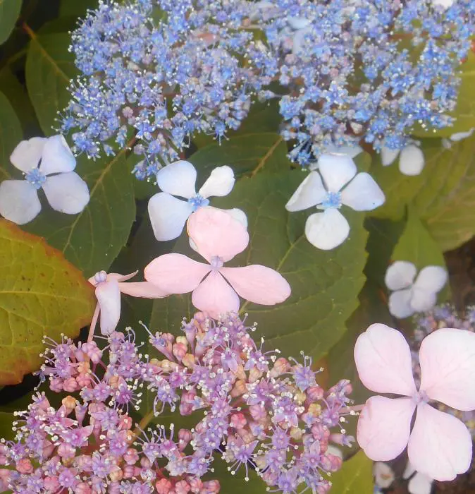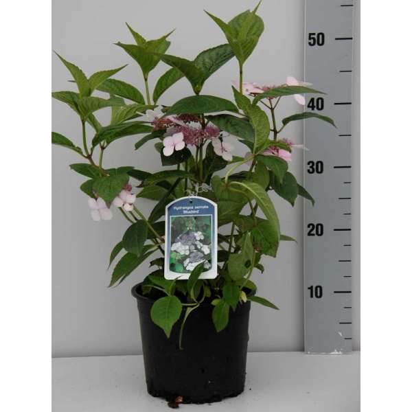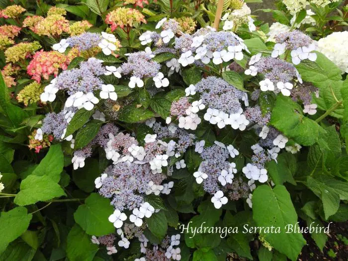 Hydrangea serrata 'Bluebird' ist eine niedrig wachsende, umbelliferartige Hortensie. Blüten blühen mit rosa bis blauen, sterilen Randblüten, abhängig von der Säure des Bodens und dem Vorhandensein von Aluminium im Boden.