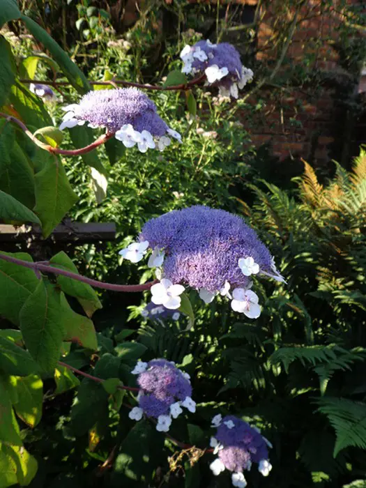 'Macrophylla': 2 m hoch, fruchtbare violette Blüten, weißlich-lila Randblüten.