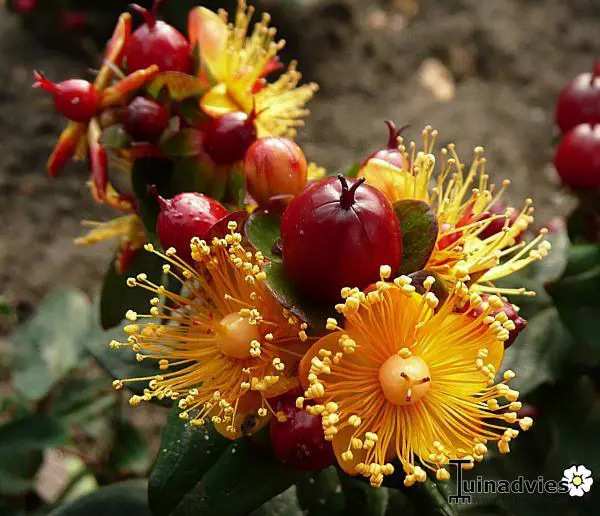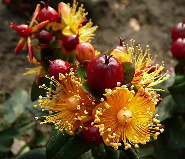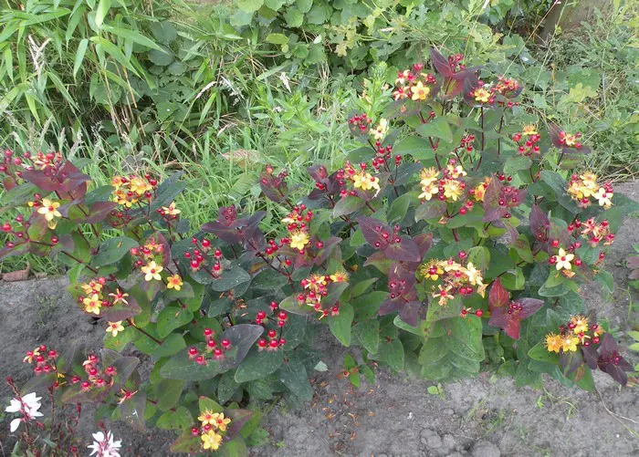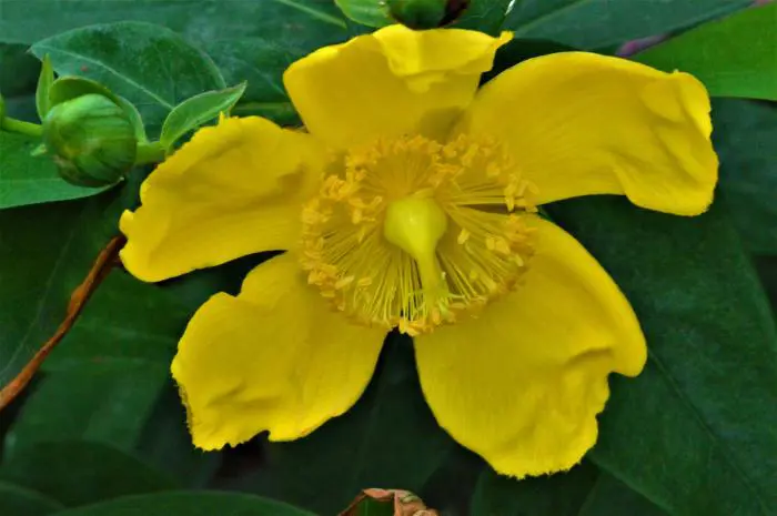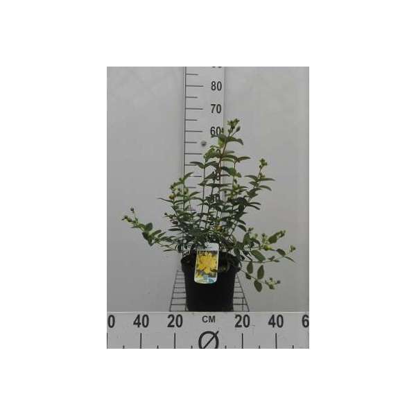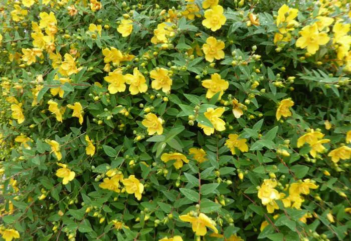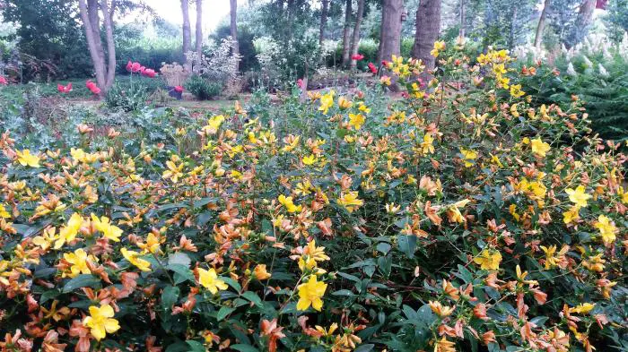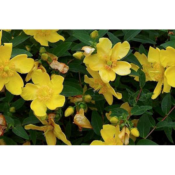 Hypericum 'Hidcote' ist ein dichter Strauch mit einer sich ausbreitenden Vegetation und dunkelgrünen, lansettförmigen Blättern. Es ist ein guter Bodendecker mit überhängenden Ästen.