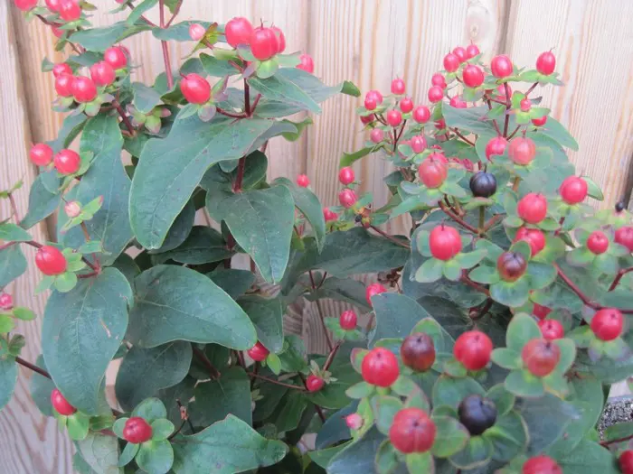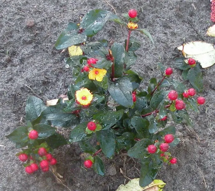 Hypericum inodorum 'MAGICAL Red' blüht mit goldgelben Blüten, gefolgt von wunderschönen roten, beerenförmigen Früchten.