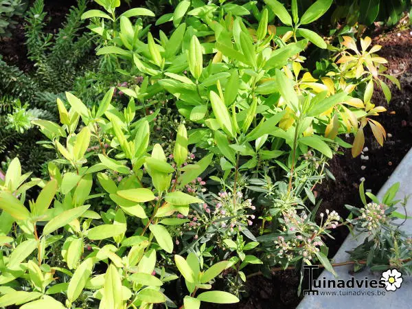 Es handelt sich um einen eng aufrechten Strauch mit schmalen, lanzettlichen, dunkelgrünen Blättern, die im Herbst rötlich-grün werden.