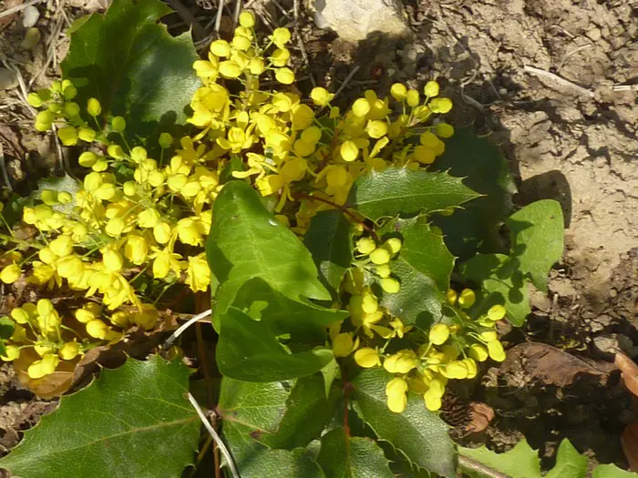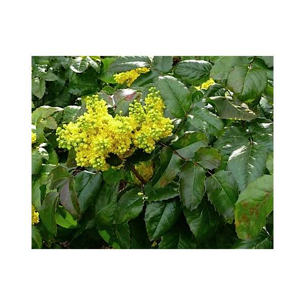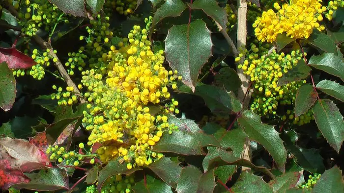 Im Frühling erscheinen Büschel tiefgelber Blüten, gefolgt von blau-schwarzen Beeren.