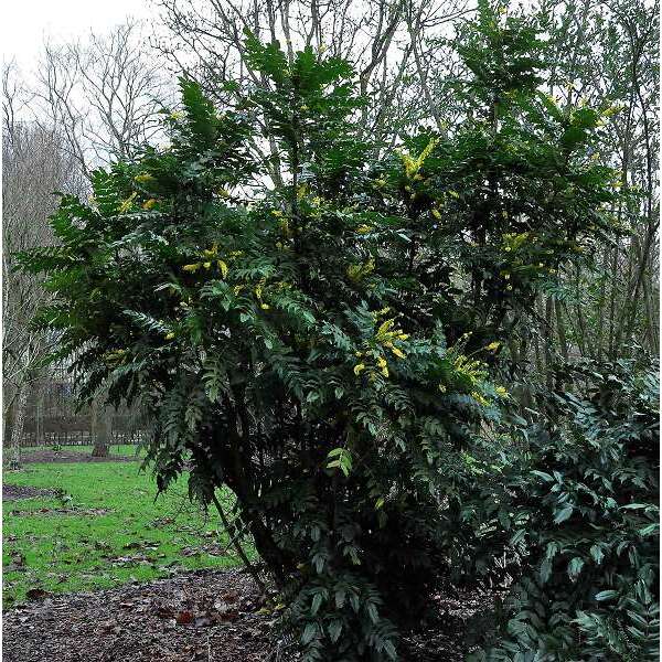 Mahonia x media 'Wintersun' hat ein großes, gefiedertes, stacheliges Blatt und reingelbe, schlanke Blütenpanisen, gefolgt von essbaren blau-schwarzen Beeren.
