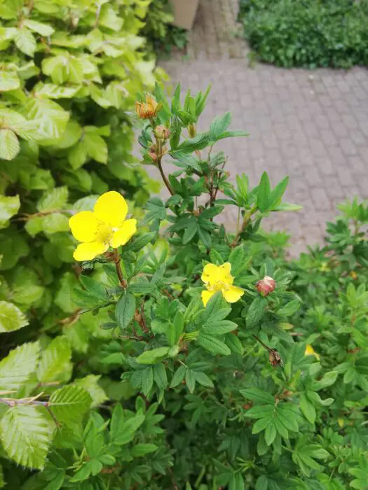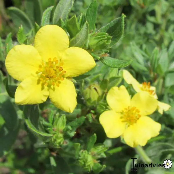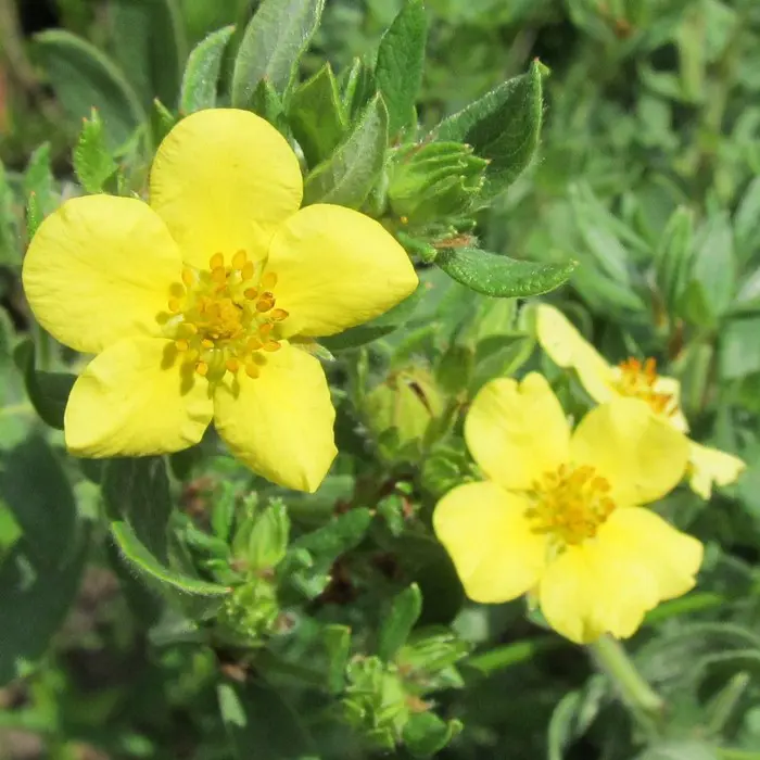Potentilla fruticosa 'Goblin' ist eine sehr dichte Sorte mit einer reichen Blüte aus becherförmigen, goldgelben Blüten, die im hellen Sonnenlicht leicht verblassen.