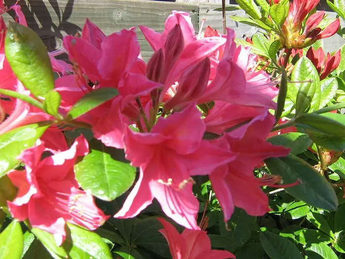 Rhododendron 'Jolie madame' blüht mit tiefpinken, sternförmigen Blüten in einer leichten orange-gelben Färbung.