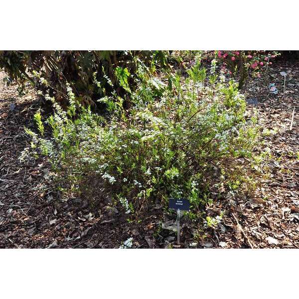 Blüht reichlich entlang der Äste mit kleinen Dolden aus weißen Blüten.