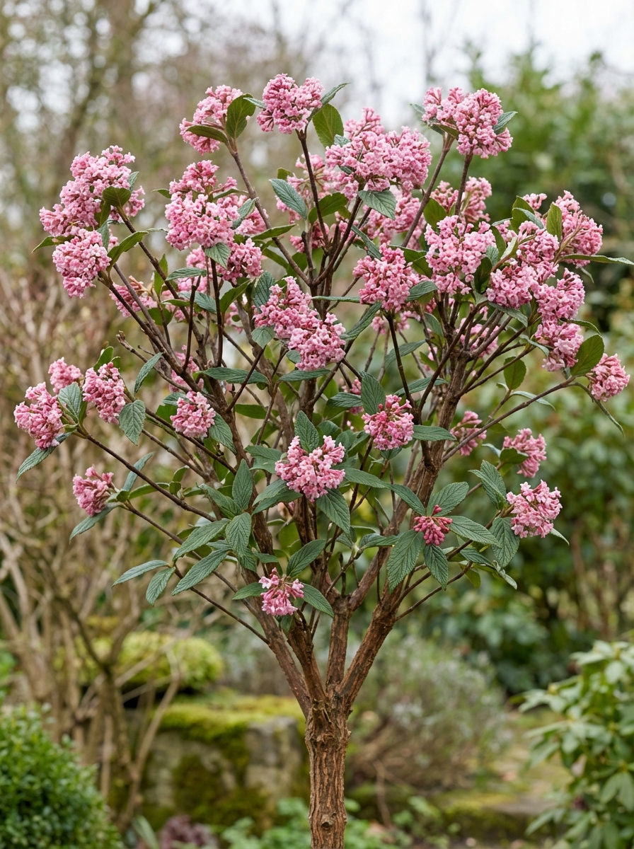 Viburnum x bodnantense 'Dawn' ist ein laubabwerfender, buschiger, aufrechter Strauch mit Büscheln voller rosa Blüten auf kahlen Ästen im Winter, gefolgt von violetten Beeren. Die Blüten sind etwas schwächer als 'Charles Lamont', sind aber eher rosa gefärbt.