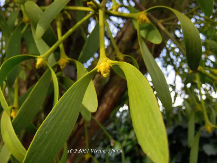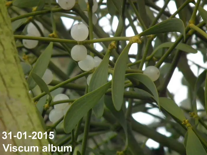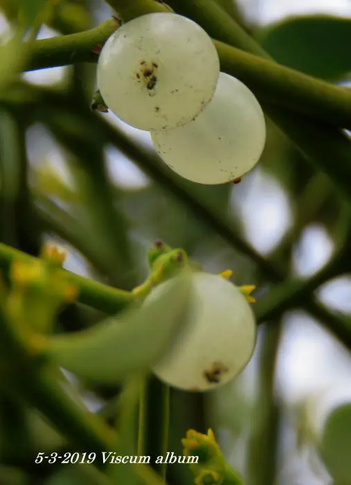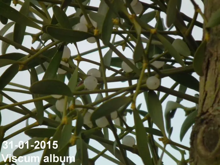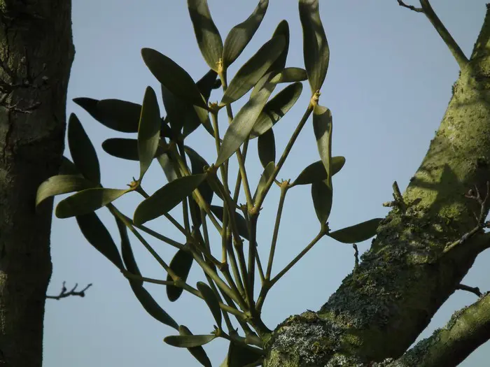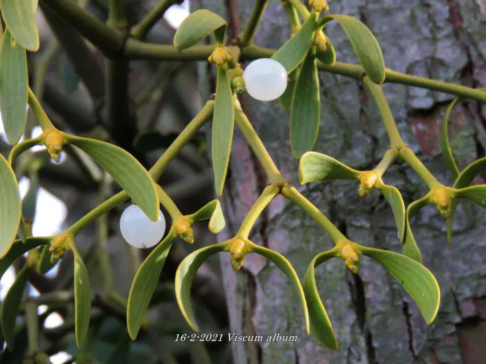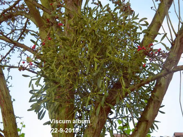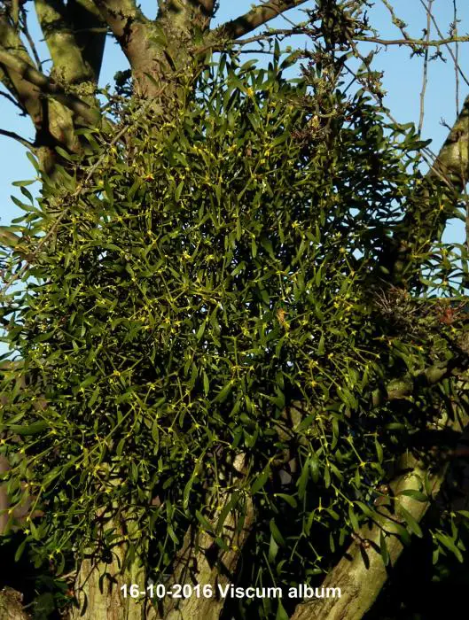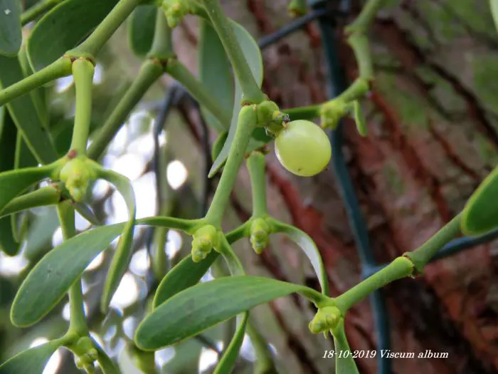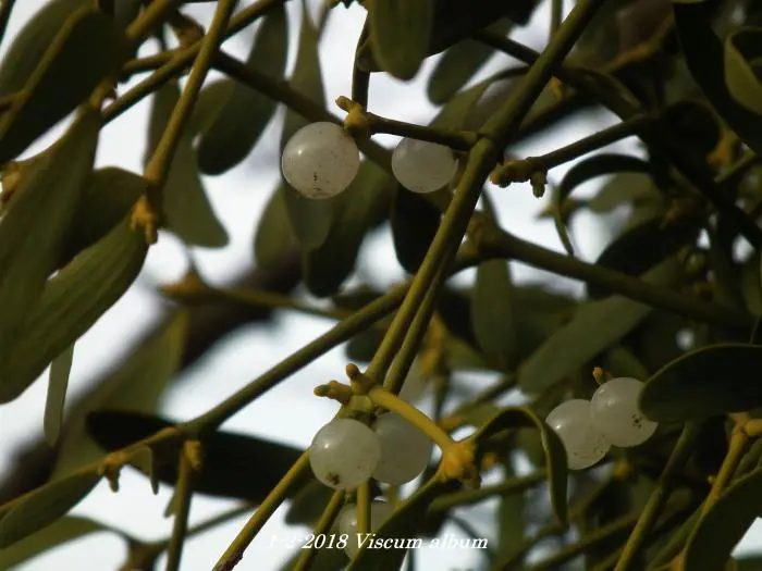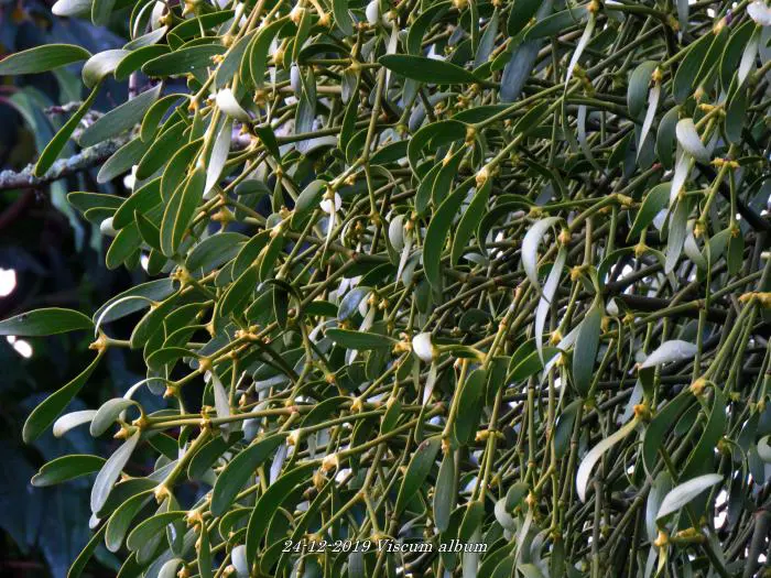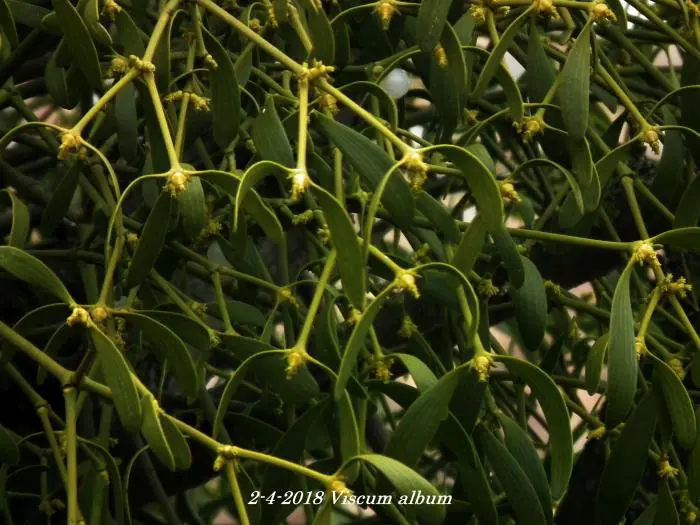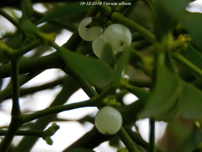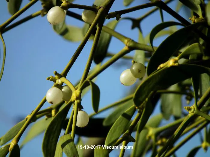 Das Viscum-Album ist besser bekannt als Mistelzweig, die wie dicke Bälle in den Bäumen hängen. Sie werden auch zu Weihnachten häufig in Blumenarrangements oder zum Aufhängen über einer Tür verwendet.