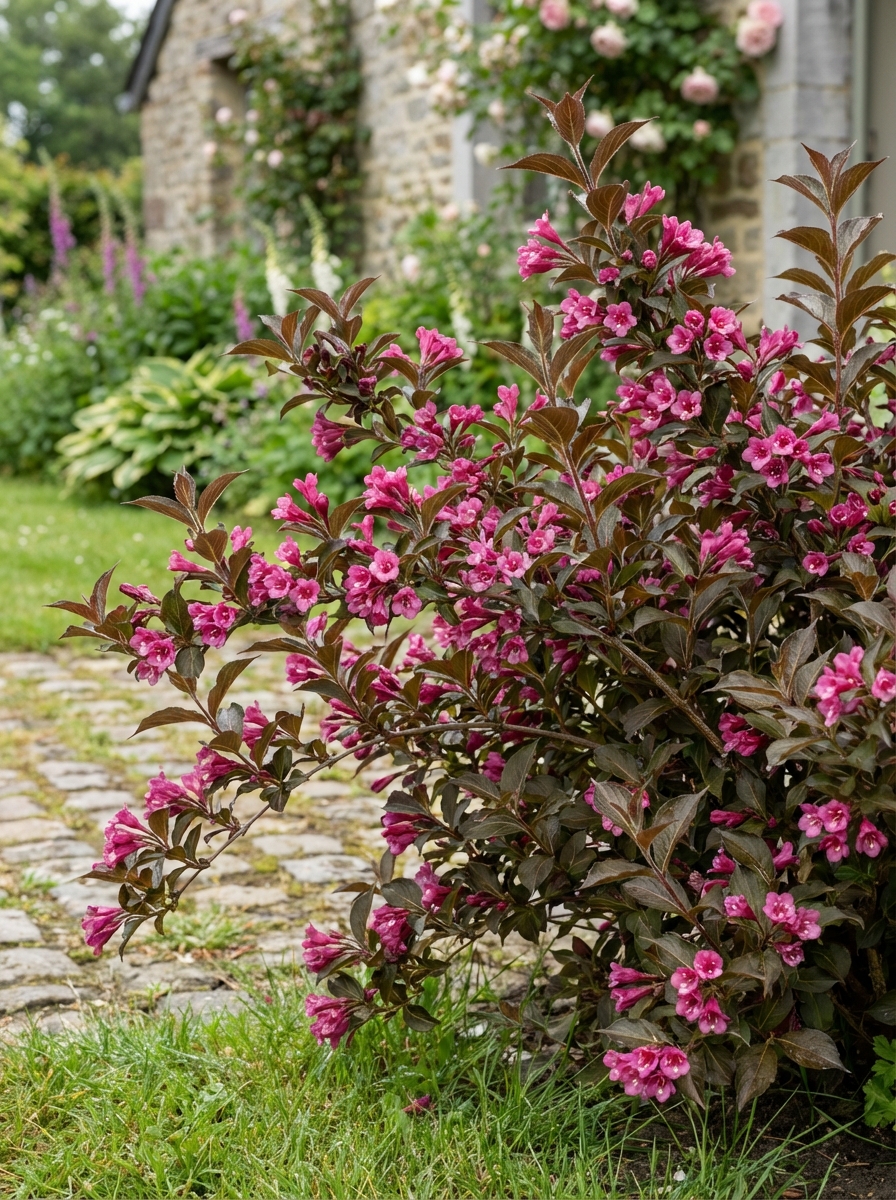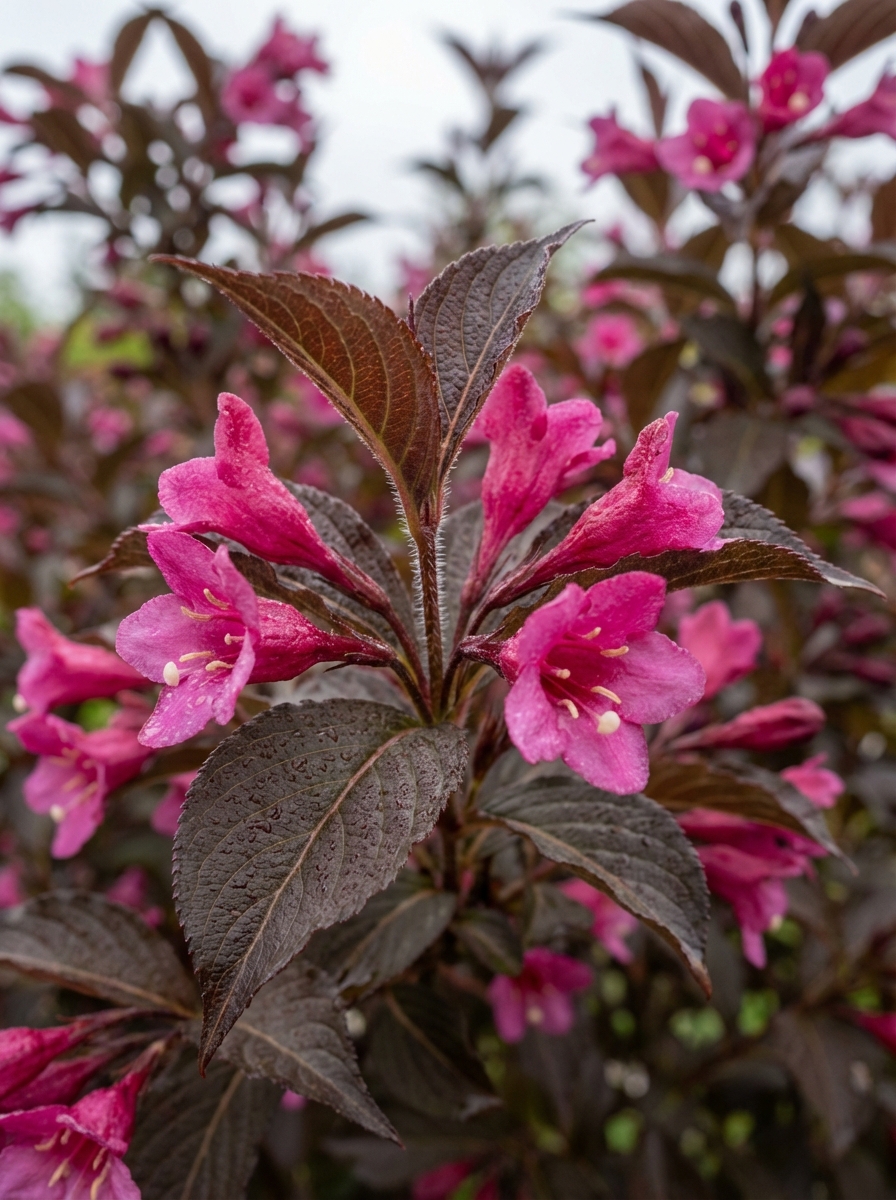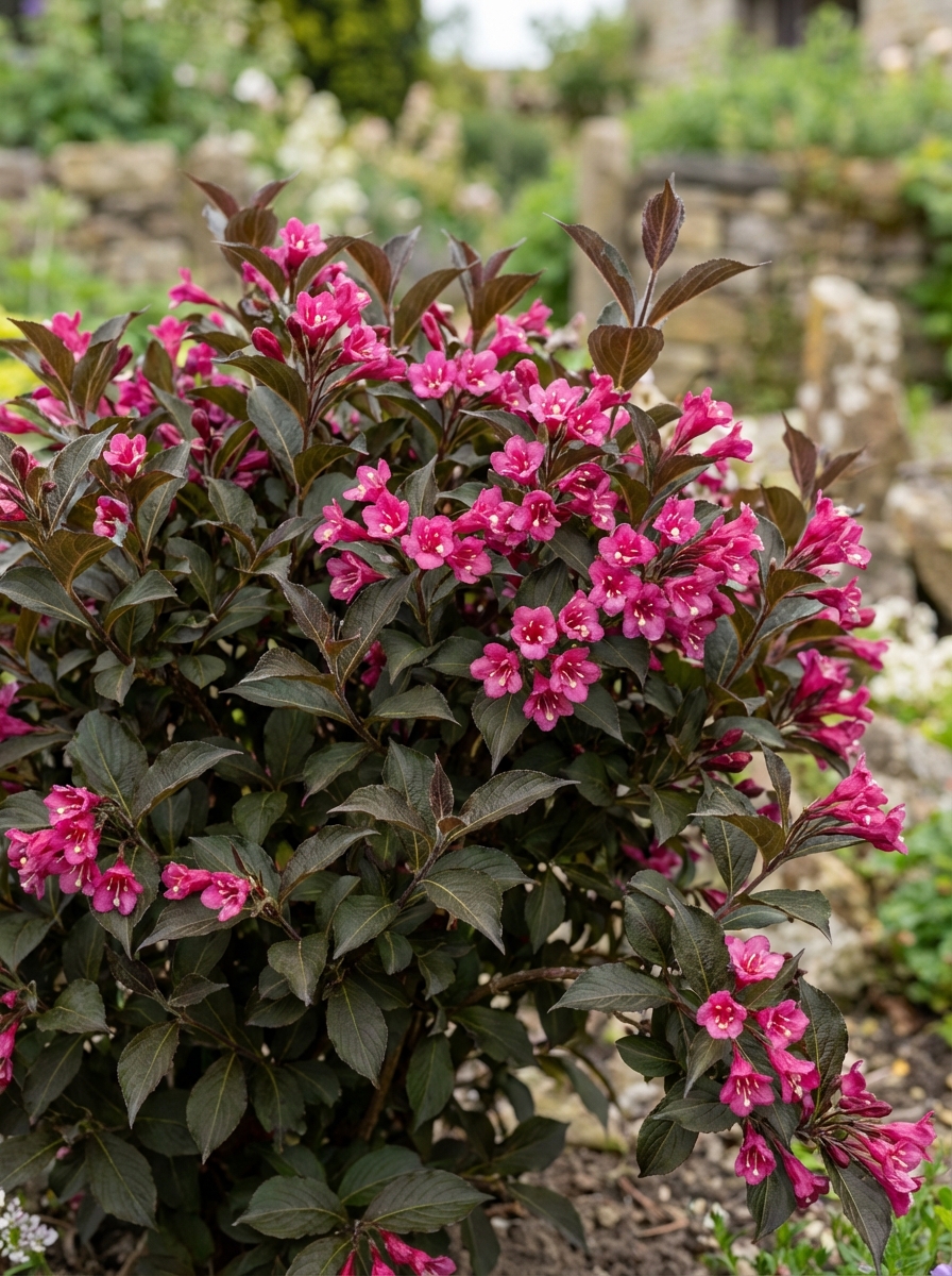 Weigela florida 'Victoria' ist ein buschiger Strauch mit einer runden, aufrechten Form und bronzen/violetten ovalen Blättern.