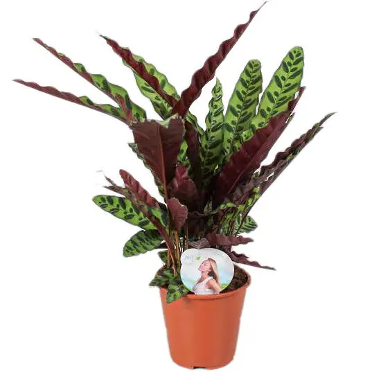 Es ist eine faszinierende Pflanze mit langen, schmalen, leicht gerippten Blättern. Die Oberseite ist hellgrün mit dunkelgrünen Markierungen und unten violett.